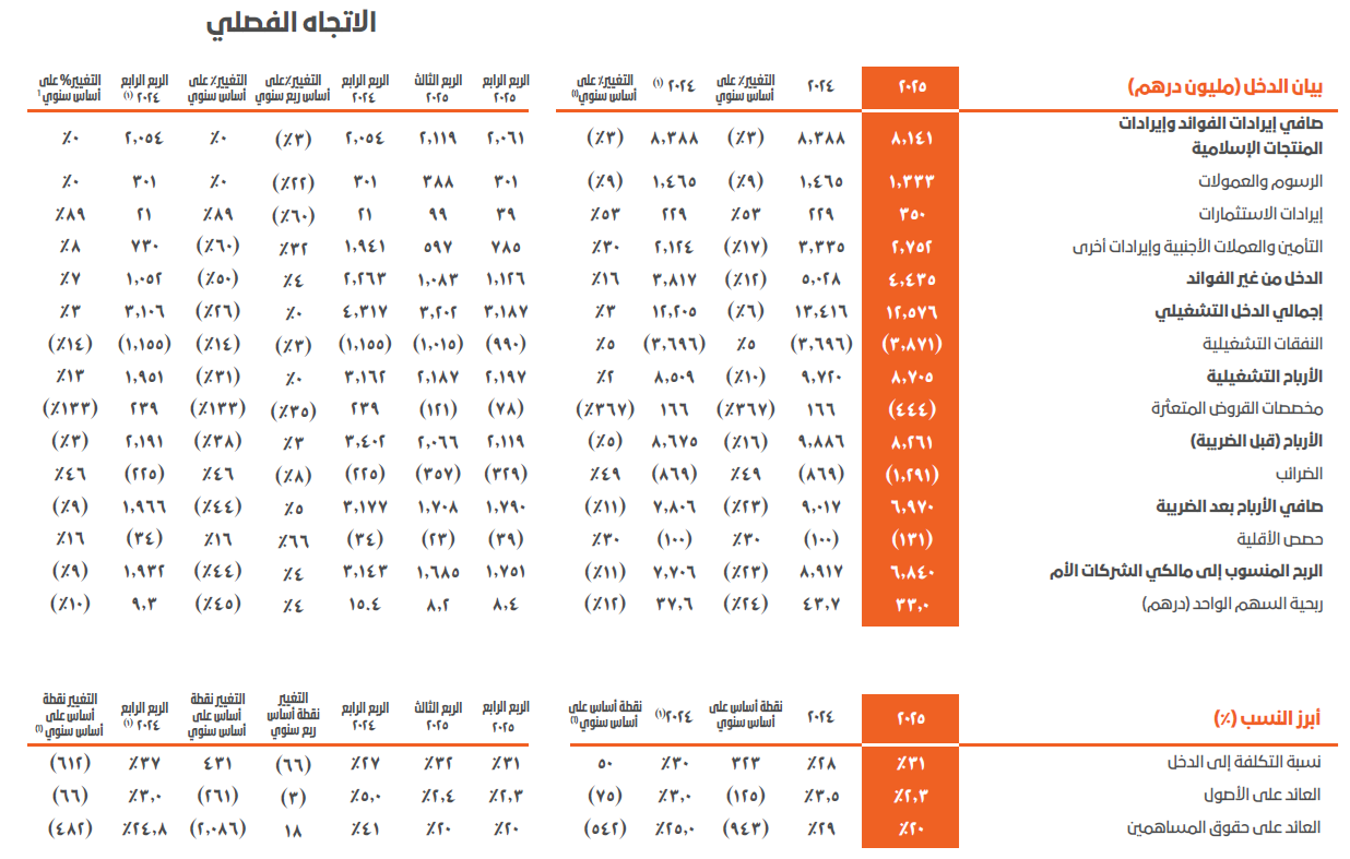 - بلغت مصاريف ضريبة الدخل 1.3 مليار درهم إماراتي في عام 2025، بزيادة قدرها 49% على أساس سنوي، ما أثّر على صافي الربح بعد الضريبة، والذي شهد انخفاضاً بنسبة 23% ليبلغ 7.0 مليار درهم إماراتي (انخفاض بنسبة 11% على أساس سنوي بعد استبعاد المكاسب الاستثنائية)، مع عائدات قوية على حقوق المساهمين بلغت نسبتها 20%.